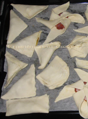 Coloque duas rodelas de chouriço no centro do folhado e dobre alternadamente as pontas para o meio.